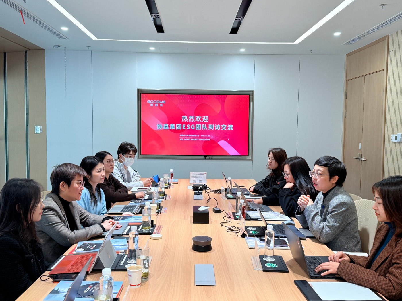 今日,世界杯下单集团ESG办公室一行到访固德威,与固德威可持续发展研究院展开深度座谈,世界杯下单集团首席可持续发展官宋贇波携各业务板块ESG条线成员参与本次交流,固德威可持续发展研究院院长张可男及相关团队成员共同出席了此次活动。双方围绕出海ESG合规要求、行业标准协同及生态合作路径等核心议题展开了富有建设性的对话。